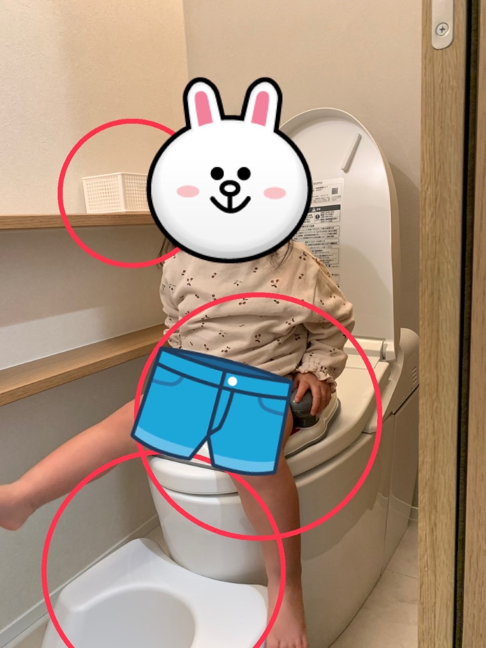 赤丸がトイレグッズで、奥のケース(100均)に便座入れてます◎
