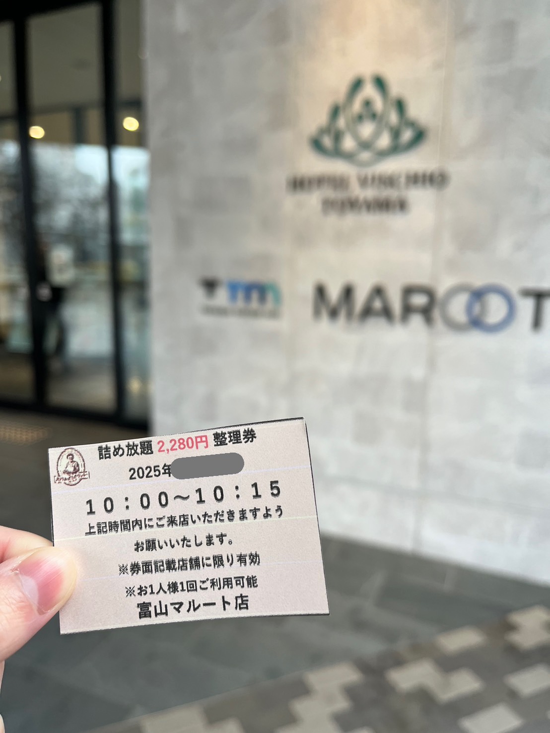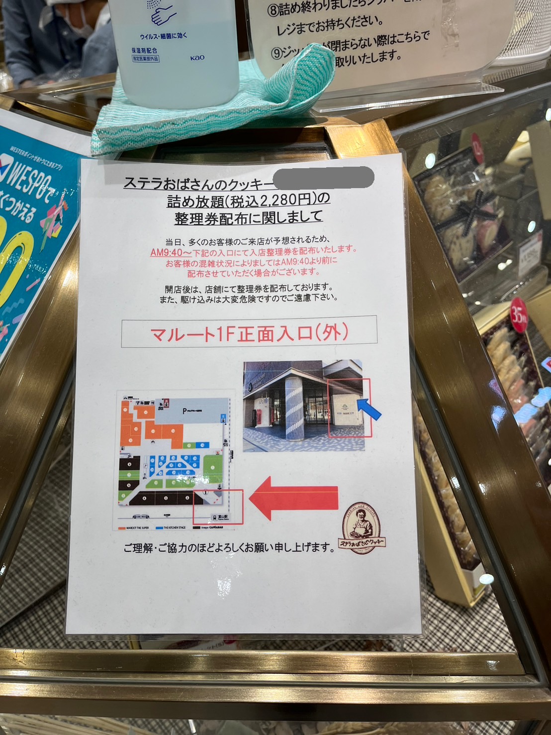 マルートの開店時間は10時ですが、混雑緩和のため、9時40分から整理券を配布されます。私は9時32分ぐらいに到着して11番目でした。配布場所は、マルート1階正面入り口前です。整理券には、「10:00-10:15」と記載されていて、1番目の枠をGET!店舗によっては14時の整理券だったとか、14時に行ってもまだ整理券余ってたとかもみたので、早い時間を狙うわけではないなら、慌てなくてもいいのかもです♡♡
